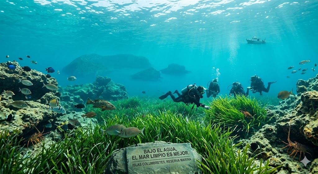 Bajo el agua todo es mejor porque el mar está muy limpio. Hay muchos peces y langostas que viven tranquilos, ya que allí no se puede pescar. En el fondo verás plantas de un verde muy vivo que limpian el agua.