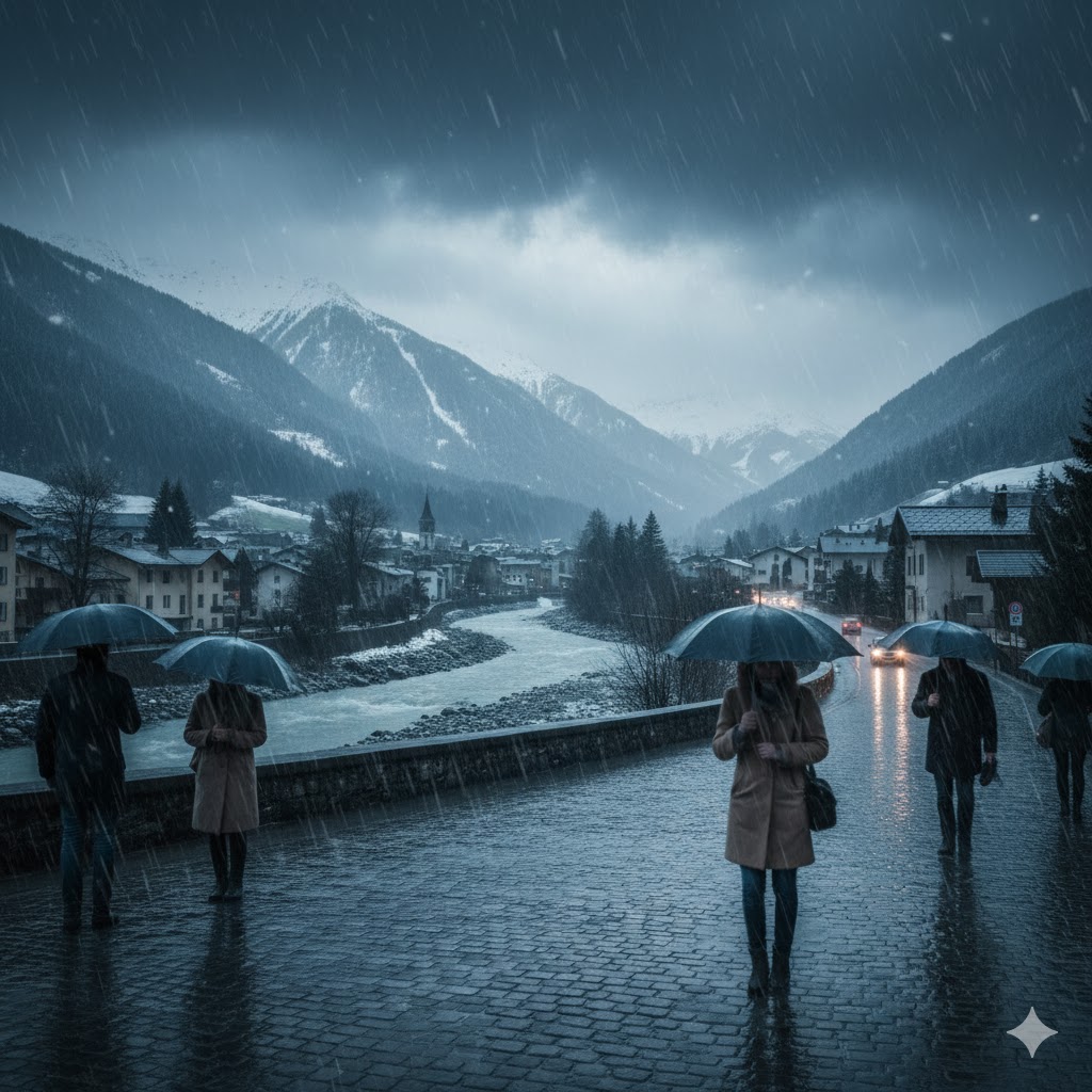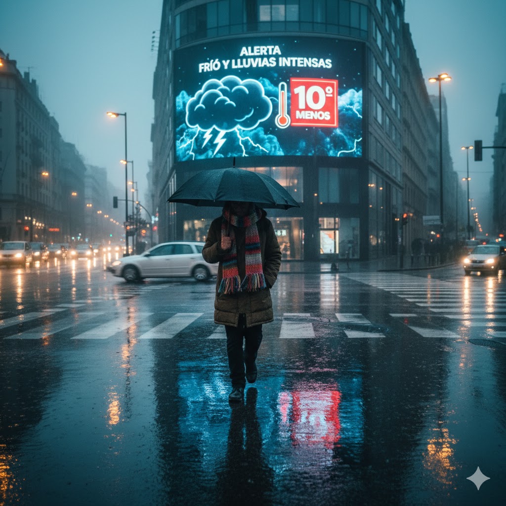 No solo vamos a tener frío. También esperamos mucha lluvia. El agua llegará a casi todas partes. En las montañas altas habrá nieve. El mapa está lleno de nubes. Los paraguas volverán a verse fuera.