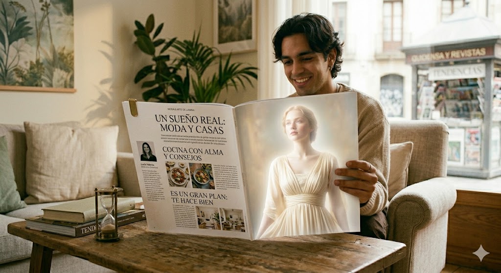 Gusta mucho a todos. La gente lee en papel. Habla de moda y casas. Tiene cocina y consejos. La foto es muy buena. Sale una chica de luz. Viste ropa de antes. Mira el futuro hoy. Es un gran plan. Todo el mundo la quiere. Es un sueño real. Te hace muy bien.